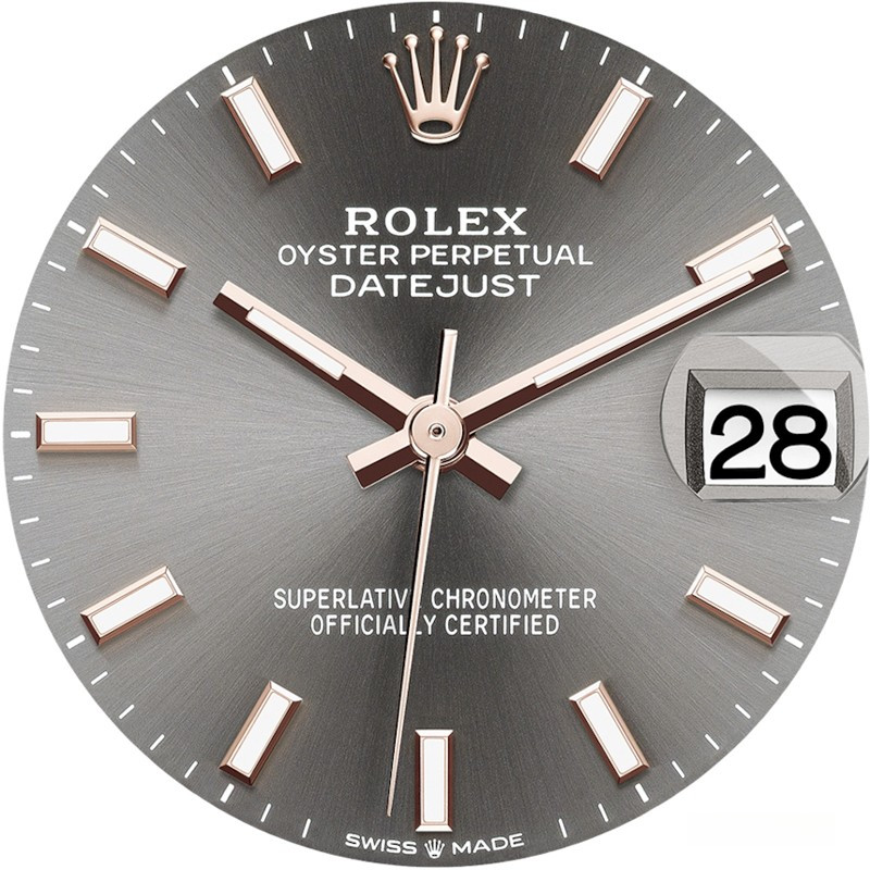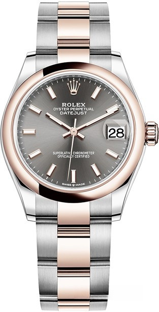 Часы Rolex Datejust Datejust 31mm Steel and Everose Gold - женские современные часы размером 31 х 10 мм из  розового золота и нержавеющей стали. Модель оснащена механизмом Rolex 2236 с устройством автоматического подзавода «Вечный ротор». Часы имеют серый циферблат, сапфировое стекло с антибликовым покрытием, а в положении «3 часа» расположено окошко даты. Знаменитая циклопная линза, добавленная к обычному стеклу, – изобретение компании Rolex 1953 года – позволяет в 2,5 раза увеличить размер даты для более удобного считывания показаний. Уровень водонепроницаемости до 100 м. Модель дополнена браслетом из 18 кратного розового золота и нержавеющей стали.