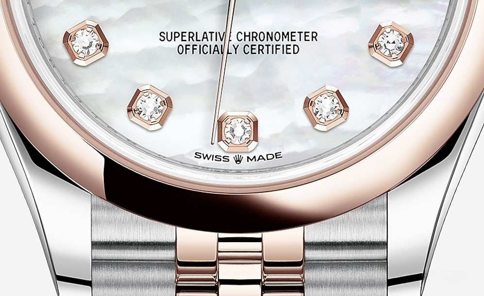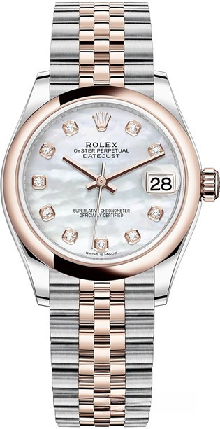 Часы Rolex Datejust Datejust 31mm Steel and Everose Gold - женские современные часы размером 31 х 10 мм из  розового золота и нержавеющей стали. Модель оснащена механизмом Rolex 2236 с устройством автоматического подзавода «Вечный ротор». Часы имеют белый жемчужный циферблат с 10-ю белыми бриллиантами, сапфировое стекло с антибликовым покрытием, а в положении «3 часа» расположено окошко даты. Знаменитая циклопная линза, добавленная к обычному стеклу, – изобретение компании Rolex 1953 года – позволяет в 2,5 раза увеличить размер даты для более удобного считывания показаний. Уровень водонепроницаемости до 100 м. Модель дополнена браслетом из 18 кратного розового золота и нержавеющей стали.