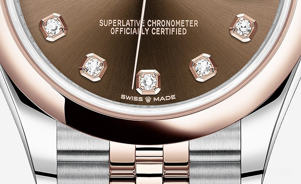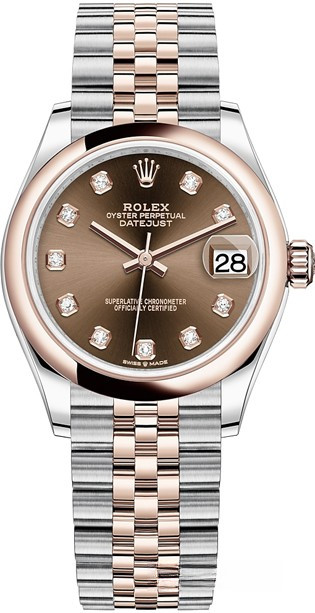 Часы Rolex Datejust Datejust 31mm Steel and Everose Gold - женские современные часы размером 31 х 10 мм из  розового золота и нержавеющей стали. Модель оснащена механизмом Rolex 2236 с устройством автоматического подзавода «Вечный ротор». Часы имеют коричневый циферблат с 10-ю белыми бриллиантами, сапфировое стекло с антибликовым покрытием, а в положении «3 часа» расположено окошко даты. Знаменитая циклопная линза, добавленная к обычному стеклу, – изобретение компании Rolex 1953 года – позволяет в 2,5 раза увеличить размер даты для более удобного считывания показаний. Уровень водонепроницаемости до 100 м. Модель дополнена браслетом из 18 кратного розового золота и нержавеющей стали.