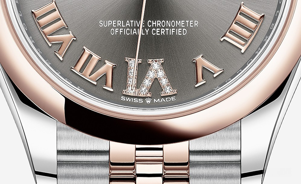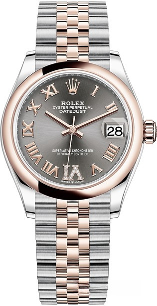 Часы Rolex Datejust Datejust 31mm Steel and Everose Gold - женские современные часы размером 31 х 10 мм из розового золота и нержавеющей стали. Модель оснащена механизмом Rolex 2236 с устройством автоматического подзавода «Вечный ротор». Часы имеют серый циферблат с белыми бриллиантами, сапфировое стекло с антибликовым покрытием, а в положении «3 часа» расположено окошко даты. Знаменитая циклопная линза, добавленная к обычному стеклу, – изобретение компании Rolex 1953 года – позволяет в 2,5 раза увеличить размер даты для более удобного считывания показаний. Уровень водонепроницаемости до 100 м. Модель дополнена браслетом из 18 кратного розового золота и нержавеющей стали.