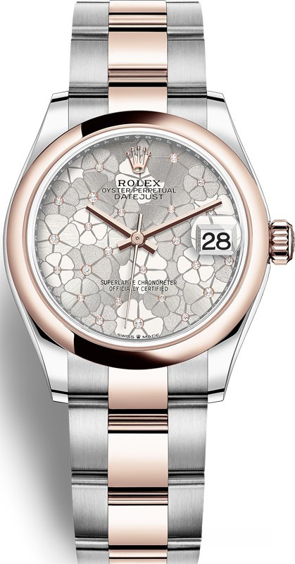 Часы Rolex Datejust Datejust 31mm Steel and Everose Gold - женские современные часы размером 31 х 10 мм из розового золота и нержавеющей стали. Модель оснащена механизмом Rolex 2236 с устройством автоматического подзавода «Вечный ротор». Часы имеют серебристый циферблат с белыми бриллиантами, сапфировое стекло с антибликовым покрытием, а в положении «3 часа» расположено окошко даты. Знаменитая циклопная линза, добавленная к обычному стеклу, – изобретение компании Rolex 1953 года – позволяет в 2,5 раза увеличить размер даты для более удобного считывания показаний. Уровень водонепроницаемости до 100 м. Модель дополнена браслетом из 18 кратного розового золота и нержавеющей стали.