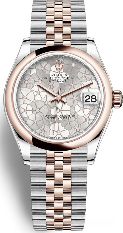 Часы Rolex Datejust Datejust 31mm Steel and Everose Gold - женские современные часы размером 31 х 10 мм из  розового золота и нержавеющей стали. Модель оснащена механизмом Rolex 2236 с устройством автоматического подзавода «Вечный ротор». Часы имеют серебристый циферблат с белыми бриллиантами, сапфировое стекло с антибликовым покрытием, а в положении «3 часа» расположено окошко даты. Знаменитая циклопная линза, добавленная к обычному стеклу, – изобретение компании Rolex 1953 года – позволяет в 2,5 раза увеличить размер даты для более удобного считывания показаний. Уровень водонепроницаемости до 100 м. Модель дополнена браслетом из 18 кратного розового золота и нержавеющей стали.