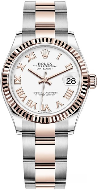 Часы Rolex Datejust Datejust 31mm Steel and Everose Gold - женские современные часы размером 31 х 10 мм из  розового золота и нержавеющей стали. Модель оснащена механизмом Rolex 2236 с устройством автоматического подзавода «Вечный ротор». Часы имеют белый циферблат, сапфировое стекло с антибликовым покрытием, а в положении «3 часа» расположено окошко даты. Знаменитая циклопная линза, добавленная к обычному стеклу, – изобретение компании Rolex 1953 года – позволяет в 2,5 раза увеличить размер даты для более удобного считывания показаний. Уровень водонепроницаемости до 100 м. Модель дополнена браслетом из 18 кратного розового золота и нержавеющей стали.