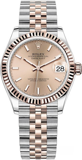 Часы Rolex Datejust Datejust 31mm Steel and Everose Gold - женские современные часы размером 31 х 10 мм из розового золота и нержавеющей стали. Модель оснащена механизмом Rolex 2236 с устройством автоматического подзавода «Вечный ротор». Часы имеют золотистый циферблат, сапфировое стекло с антибликовым покрытием, а в положении «3 часа» расположено окошко даты. Знаменитая циклопная линза, добавленная к обычному стеклу, – изобретение компании Rolex 1953 года – позволяет в 2,5 раза увеличить размер даты для более удобного считывания показаний. Уровень водонепроницаемости до 100 м. Модель дополнена браслетом из 18 кратного розового золота и нержавеющей стали.