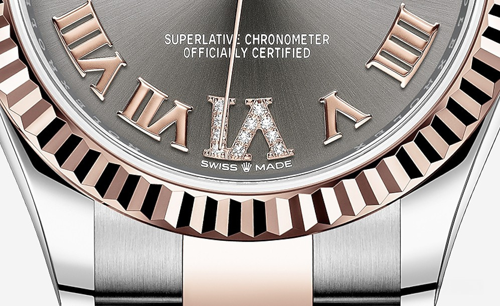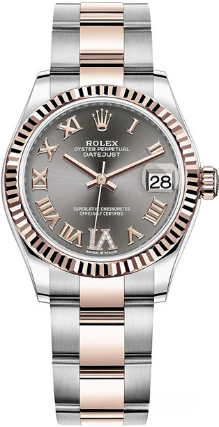 Часы Rolex Datejust Datejust 31mm Steel and Everose Gold - женские современные часы размером 31 х 10 мм из  розового золота и нержавеющей стали. Модель оснащена механизмом Rolex 2236 с устройством автоматического подзавода «Вечный ротор». Часы имеют серый циферблат с белыми бриллиантами, сапфировое стекло с антибликовым покрытием, а в положении «3 часа» расположено окошко даты. Знаменитая циклопная линза, добавленная к обычному стеклу, – изобретение компании Rolex 1953 года – позволяет в 2,5 раза увеличить размер даты для более удобного считывания показаний. Уровень водонепроницаемости до 100 м. Модель дополнена браслетом из 18 кратного розового золота и нержавеющей стали.