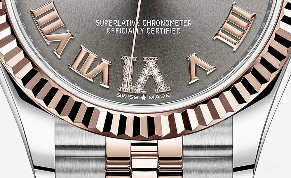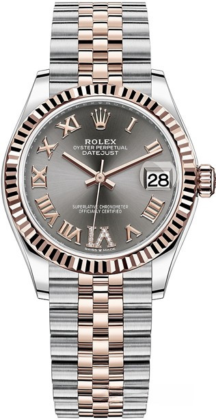 Часы Rolex Datejust Datejust 31mm Steel and Everose Gold - женские современные часы размером 31 х 10 мм из  розового золота и нержавеющей стали. Модель оснащена механизмом Rolex 2236 с устройством автоматического подзавода «Вечный ротор». Часы имеют серый циферблат с белыми бриллиантами, сапфировое стекло с антибликовым покрытием, а в положении «3 часа» расположено окошко даты. Знаменитая циклопная линза, добавленная к обычному стеклу, – изобретение компании Rolex 1953 года – позволяет в 2,5 раза увеличить размер даты для более удобного считывания показаний. Уровень водонепроницаемости до 100 м. Модель дополнена браслетом из 18 кратного розового золота и нержавеющей стали.