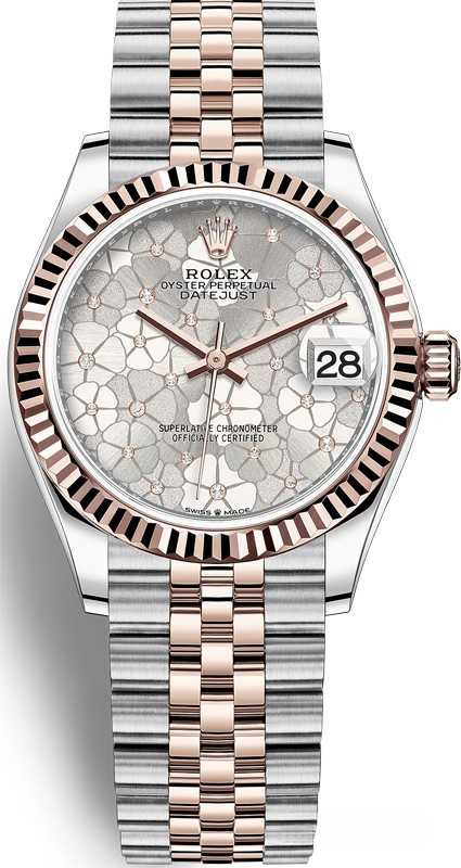 Часы Rolex Datejust Datejust 31mm Steel and Everose Gold - женские современные часы размером 31 х 10 мм из  розового золота и нержавеющей стали. Модель оснащена механизмом Rolex 2236 с устройством автоматического подзавода «Вечный ротор». Часы имеют серебристый циферблат с белыми бриллиантами, сапфировое стекло с антибликовым покрытием, а в положении «3 часа» расположено окошко даты. Знаменитая циклопная линза, добавленная к обычному стеклу, – изобретение компании Rolex 1953 года – позволяет в 2,5 раза увеличить размер даты для более удобного считывания показаний. Уровень водонепроницаемости до 100 м. Модель дополнена браслетом из 18 кратного розового золота и нержавеющей стали.