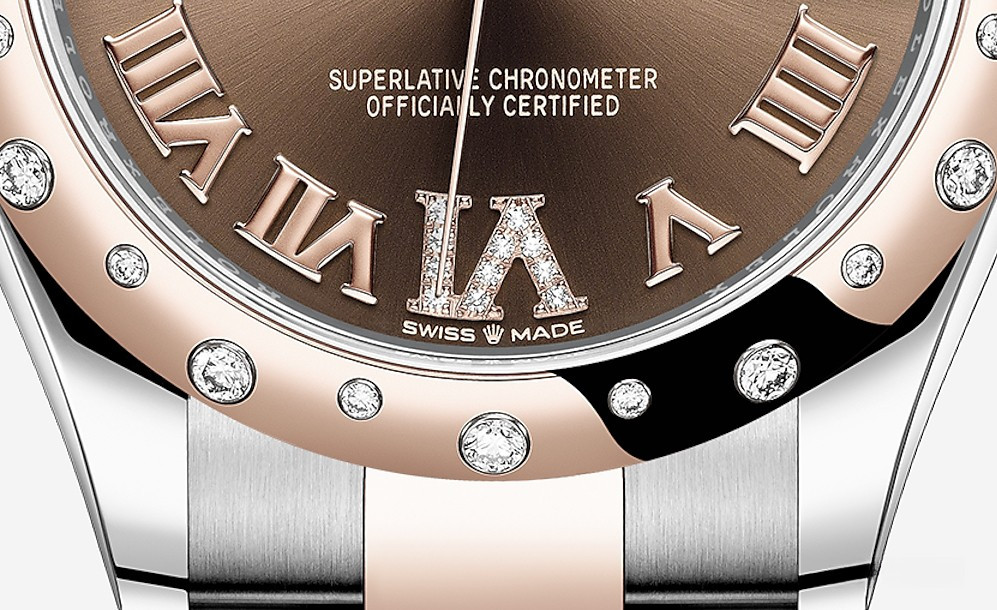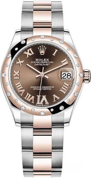 Часы Rolex Datejust Datejust 31mm Steel and Everose Gold - женские современные часы размером 31 х 10 мм из  розового золота и нержавеющей стали. Модель оснащена механизмом Rolex 2236 с устройством автоматического подзавода «Вечный ротор». Часы имеют коричневый циферблат с белыми бриллиантами, сапфировое стекло с антибликовым покрытием, а в положении «3 часа» расположено окошко даты. Знаменитая циклопная линза, добавленная к обычному стеклу, – изобретение компании Rolex 1953 года – позволяет в 2,5 раза увеличить размер даты для более удобного считывания показаний. Уровень водонепроницаемости до 100 м. Модель дополнена браслетом из 18 кратного розового золота и нержавеющей стали. Безель из белых бриллиантов.