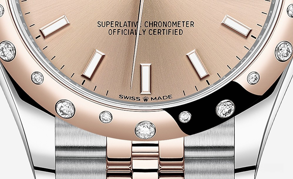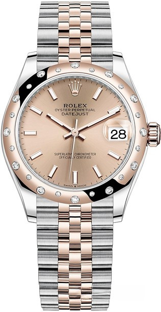 Часы Rolex Datejust Datejust 31mm Steel and Everose Gold - женские современные часы размером 31 х 10 мм из  розового золота и нержавеющей стали. Модель оснащена механизмом Rolex 2236 с устройством автоматического подзавода «Вечный ротор». Часы имеют золотистый циферблат, сапфировое стекло с антибликовым покрытием, а в положении «3 часа» расположено окошко даты. Знаменитая циклопная линза, добавленная к обычному стеклу, – изобретение компании Rolex 1953 года – позволяет в 2,5 раза увеличить размер даты для более удобного считывания показаний. Уровень водонепроницаемости до 100 м. Модель дополнена браслетом из 18 кратного розового золота и нержавеющей стали. Безель из белых бриллиантов.