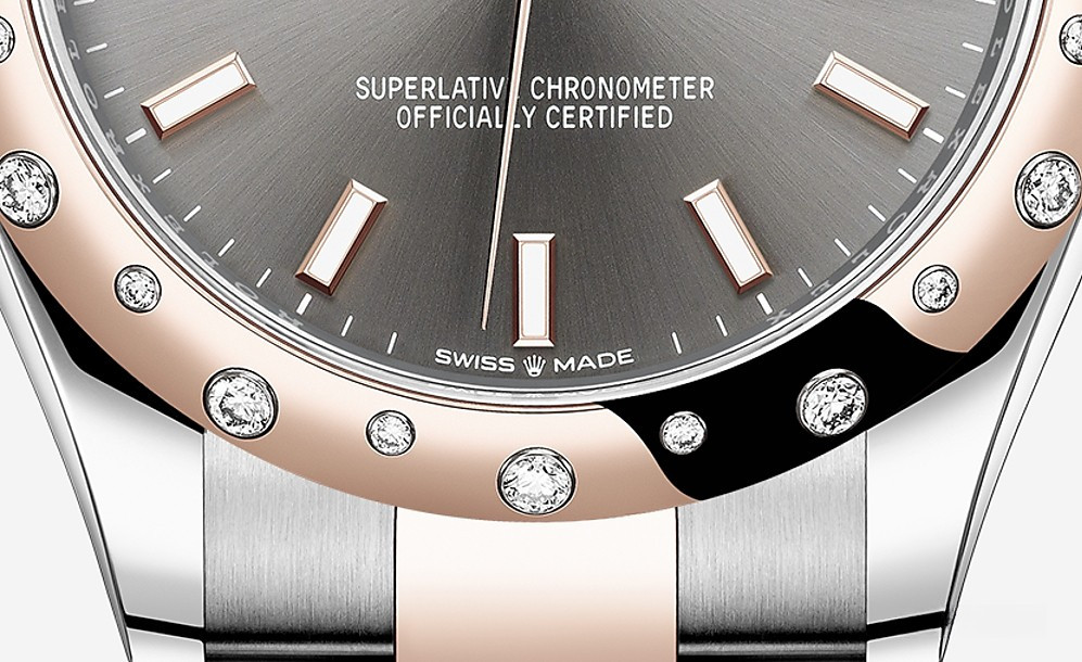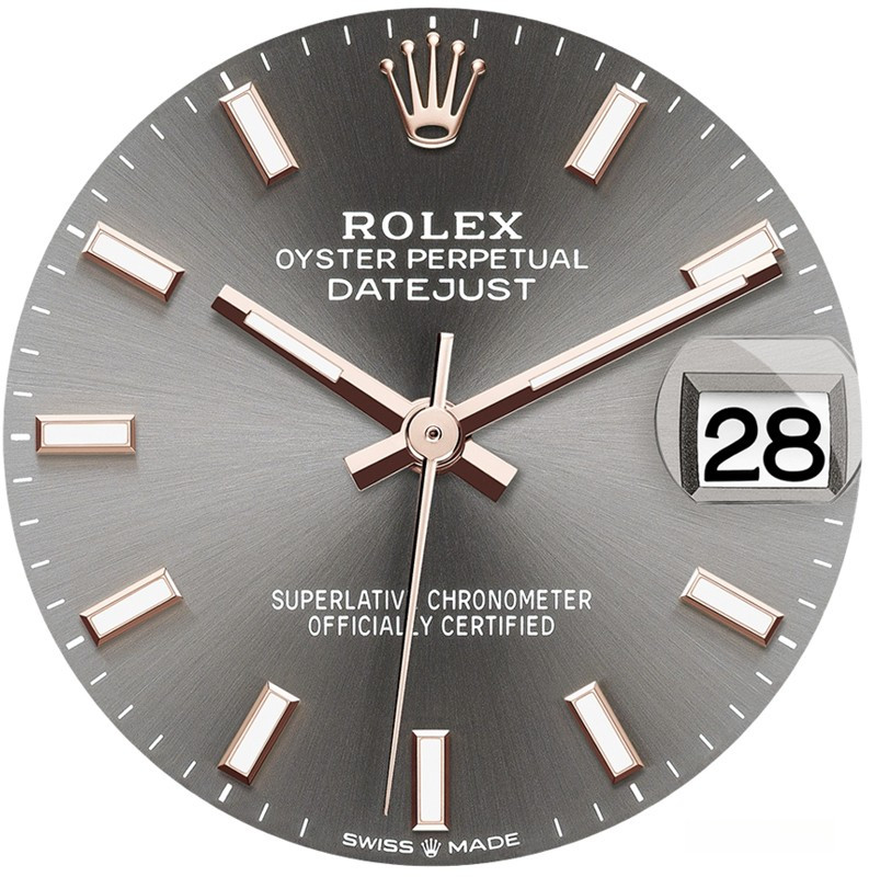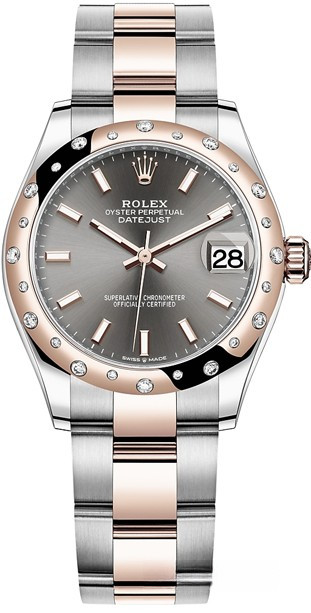Часы Rolex Datejust Datejust 31mm Steel and Everose Gold - женские современные часы размером 31 х 10 мм из  розового золота и нержавеющей стали. Модель оснащена механизмом Rolex 2236 с устройством автоматического подзавода «Вечный ротор». Часы имеют серый циферблат, сапфировое стекло с антибликовым покрытием, а в положении «3 часа» расположено окошко даты. Знаменитая циклопная линза, добавленная к обычному стеклу, – изобретение компании Rolex 1953 года – позволяет в 2,5 раза увеличить размер даты для более удобного считывания показаний. Уровень водонепроницаемости до 100 м. Модель дополнена браслетом из 18 кратного розового золота и нержавеющей стали. Безель из белых бриллиантов.