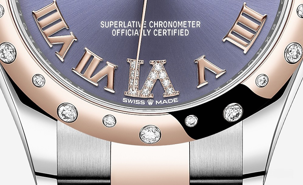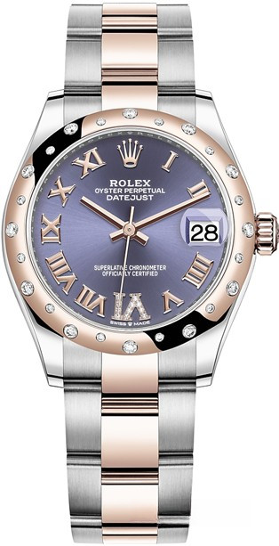Часы Rolex Datejust Datejust 31mm Steel and Everose Gold - женские современные часы размером 31 х 10 мм из розового золота и нержавеющей стали. Модель оснащена механизмом Rolex 2236 с устройством автоматического подзавода «Вечный ротор». Часы имеют синий циферблат с белыми бриллиантами, сапфировое стекло с антибликовым покрытием, а в положении «3 часа» расположено окошко даты. Знаменитая циклопная линза, добавленная к обычному стеклу, – изобретение компании Rolex 1953 года – позволяет в 2,5 раза увеличить размер даты для более удобного считывания показаний. Уровень водонепроницаемости до 100 м. Модель дополнена браслетом из 18 кратного розового золота и нержавеющей стали. Безель из белых бриллиантов.