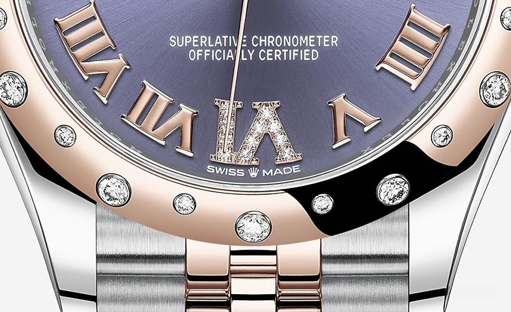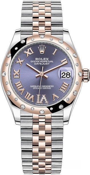 Часы Rolex Datejust Datejust 31mm Steel and Everose Gold - женские современные часы размером 31 х 10 мм из  розового золота и нержавеющей стали. Модель оснащена механизмом Rolex 2236 с устройством автоматического подзавода «Вечный ротор». Часы имеют синий циферблат с белыми бриллиантами, сапфировое стекло с антибликовым покрытием, а в положении «3 часа» расположено окошко даты. Знаменитая циклопная линза, добавленная к обычному стеклу, – изобретение компании Rolex 1953 года – позволяет в 2,5 раза увеличить размер даты для более удобного считывания показаний. Уровень водонепроницаемости до 100 м. Модель дополнена браслетом из 18 кратного розового золота и нержавеющей стали. Безель из белых бриллиантов.