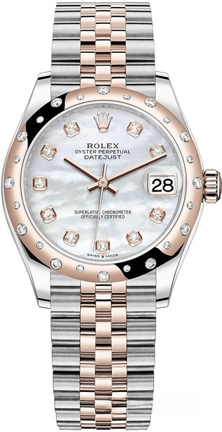 Часы Rolex Datejust Datejust 31mm Steel and Everose Gold - женские современные часы размером 31 х 10 мм из  розового золота и нержавеющей стали. Модель оснащена механизмом Rolex 2236 с устройством автоматического подзавода «Вечный ротор». Часы имеют белый жемчужный циферблат с 10-ю белыми бриллиантами, сапфировое стекло с антибликовым покрытием, а в положении «3 часа» расположено окошко даты. Знаменитая циклопная линза, добавленная к обычному стеклу, – изобретение компании Rolex 1953 года – позволяет в 2,5 раза увеличить размер даты для более удобного считывания показаний. Уровень водонепроницаемости до 100 м. Модель дополнена браслетом из 18 кратного розового золота и нержавеющей стали. Безель из белых бриллиантов.