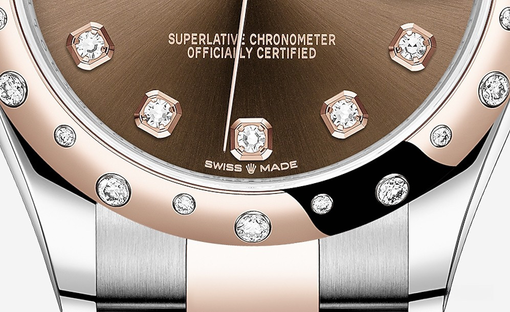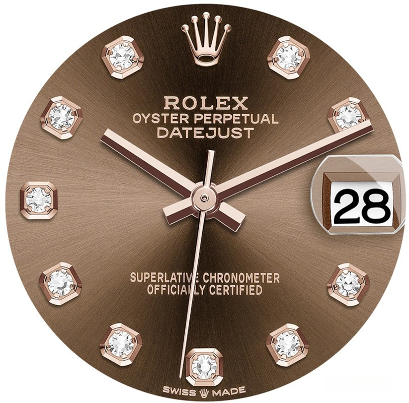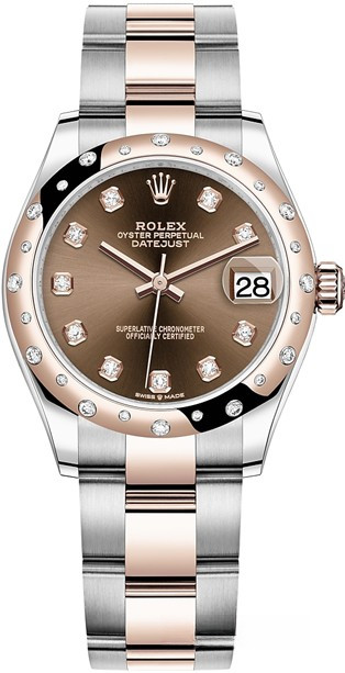 Часы Rolex Datejust Datejust 31mm Steel and Everose Gold - женские современные часы размером 31 х 10 мм из  розового золота и нержавеющей стали. Модель оснащена механизмом Rolex 2236 с устройством автоматического подзавода «Вечный ротор». Часы имеют коричневый циферблат с 10-ю белыми бриллиантами, сапфировое стекло с антибликовым покрытием, а в положении «3 часа» расположено окошко даты. Знаменитая циклопная линза, добавленная к обычному стеклу, – изобретение компании Rolex 1953 года – позволяет в 2,5 раза увеличить размер даты для более удобного считывания показаний. Уровень водонепроницаемости до 100 м. Модель дополнена браслетом из 18 кратного розового золота и нержавеющей стали. Безель из белых бриллиантов.