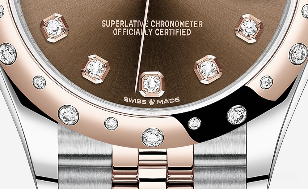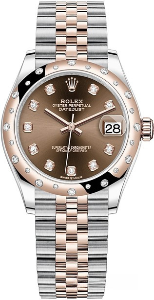 Часы Rolex Datejust Datejust 31mm Steel and Everose Gold - женские современные часы размером 31 х 10 мм из  розового золота и нержавеющей стали. Модель оснащена механизмом Rolex 2236 с устройством автоматического подзавода «Вечный ротор». Часы имеют коричневый циферблат с 10-ю белыми бриллиантами, сапфировое стекло с антибликовым покрытием, а в положении «3 часа» расположено окошко даты. Знаменитая циклопная линза, добавленная к обычному стеклу, – изобретение компании Rolex 1953 года – позволяет в 2,5 раза увеличить размер даты для более удобного считывания показаний. Уровень водонепроницаемости до 100 м. Модель дополнена браслетом из 18 кратного розового золота и нержавеющей стали. Безель из белых бриллиантов.