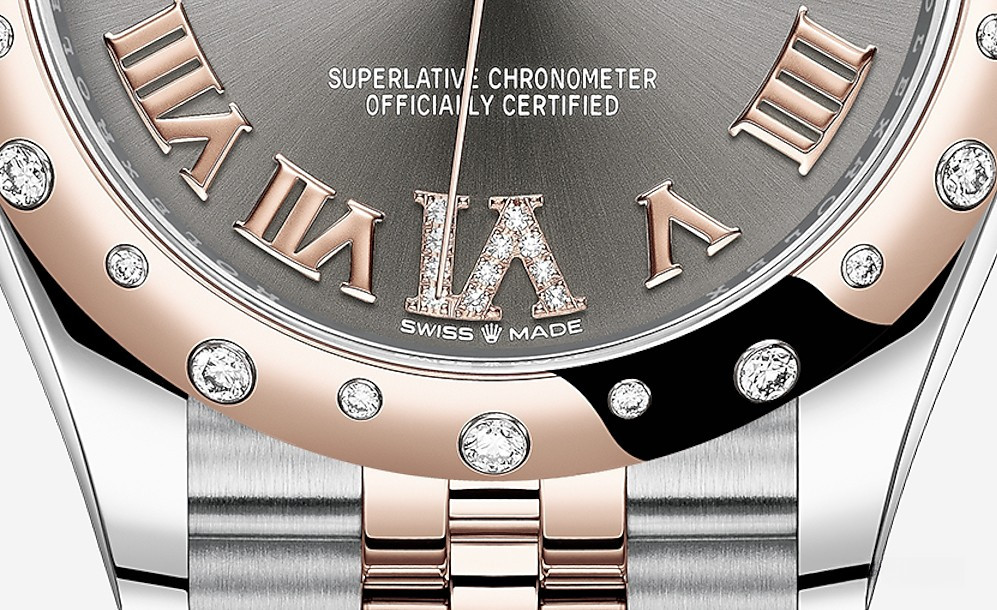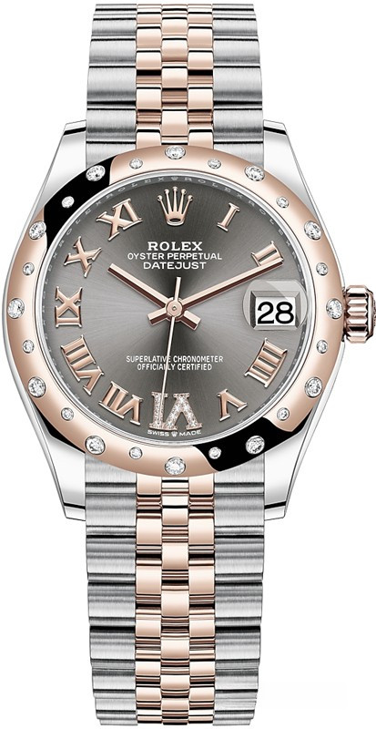 Часы Rolex Datejust Datejust 31mm Steel and Everose Gold - женские современные часы диаметром 31 х 10 мм из розового золота и нержавеющей стали. Модель оснащена механизмом Rolex 2235 с устройством автоматического подзавода «Вечный ротор». Часы имеют серый циферблат с белыми бриллиантами, сапфировое стекло с антибликовым покрытием, а в положении «3 часа» расположено окошко даты. Знаменитая циклопная линза, добавленная к обычному стеклу, – изобретение компании Rolex 1953 года – позволяет в 2,5 раза увеличить размер даты для более удобного считывания показаний. Уровень водонепроницаемости до 100 м. Модель дополнена браслетом из 18 кратного розового золота и нержавеющей стали. Безель из белых бриллиантов.