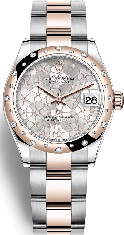 Часы Rolex Datejust Datejust 31mm Steel and Everose Gold - женские современные часы размером 31 х 10 мм из  розового золота и нержавеющей стали. Модель оснащена механизмом Rolex 2236 с устройством автоматического подзавода «Вечный ротор». Часы имеют серебристый циферблат с белыми бриллиантами, сапфировое стекло с антибликовым покрытием, а в положении «3 часа» расположено окошко даты. Знаменитая циклопная линза, добавленная к обычному стеклу, – изобретение компании Rolex 1953 года – позволяет в 2,5 раза увеличить размер даты для более удобного считывания показаний. Уровень водонепроницаемости до 100 м. Модель дополнена браслетом из 18 кратного розового золота и нержавеющей стали. Безель из белых бриллиантов.
