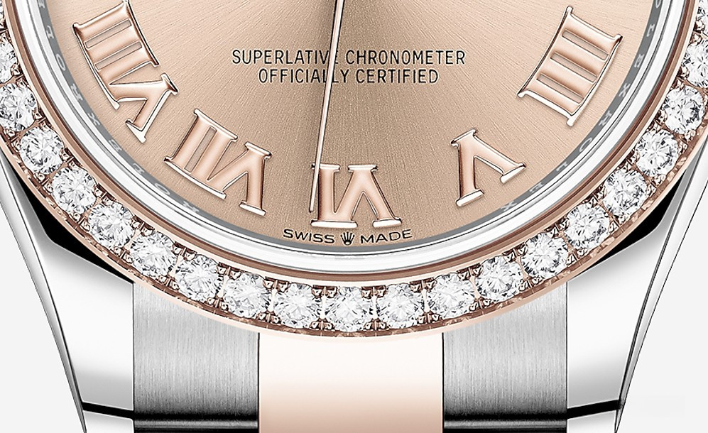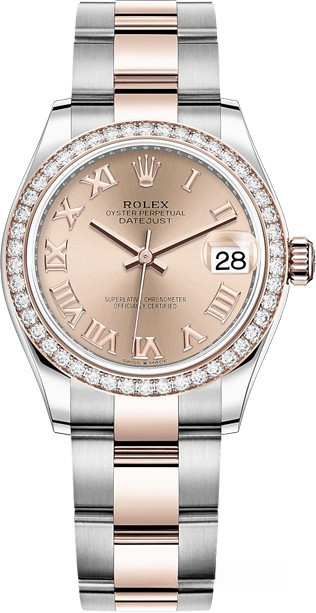Часы Rolex Datejust Datejust 31mm Steel and Everose Gold - женские современные часы размером 31 х 10 мм из  розового золота и нержавеющей стали. Модель оснащена механизмом Rolex 2236 с устройством автоматического подзавода «Вечный ротор». Часы имеют золотистый циферблат, сапфировое стекло с антибликовым покрытием, а в положении «3 часа» расположено окошко даты. Знаменитая циклопная линза, добавленная к обычному стеклу, – изобретение компании Rolex 1953 года – позволяет в 2,5 раза увеличить размер даты для более удобного считывания показаний. Уровень водонепроницаемости до 100 м. Модель дополнена браслетом из 18 кратного розового золота и нержавеющей стали. Безель из белых бриллиантов.
