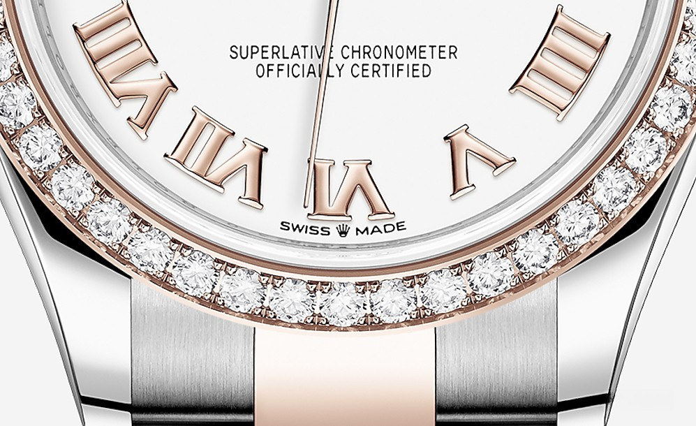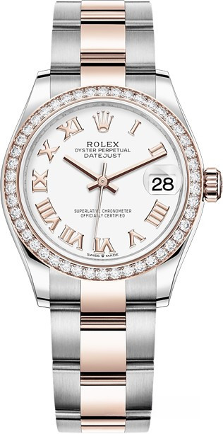 Часы Rolex Datejust Datejust 31mm Steel and Everose Gold - женские современные часы размером 31 х 10 мм из  розового золота и нержавеющей стали. Модель оснащена механизмом Rolex 2236 с устройством автоматического подзавода «Вечный ротор». Часы имеют белый циферблат, сапфировое стекло с антибликовым покрытием, а в положении «3 часа» расположено окошко даты. Знаменитая циклопная линза, добавленная к обычному стеклу, – изобретение компании Rolex 1953 года – позволяет в 2,5 раза увеличить размер даты для более удобного считывания показаний. Уровень водонепроницаемости до 100 м. Модель дополнена браслетом из 18 кратного розового золота и нержавеющей стали. Безель из белых бриллиантов.