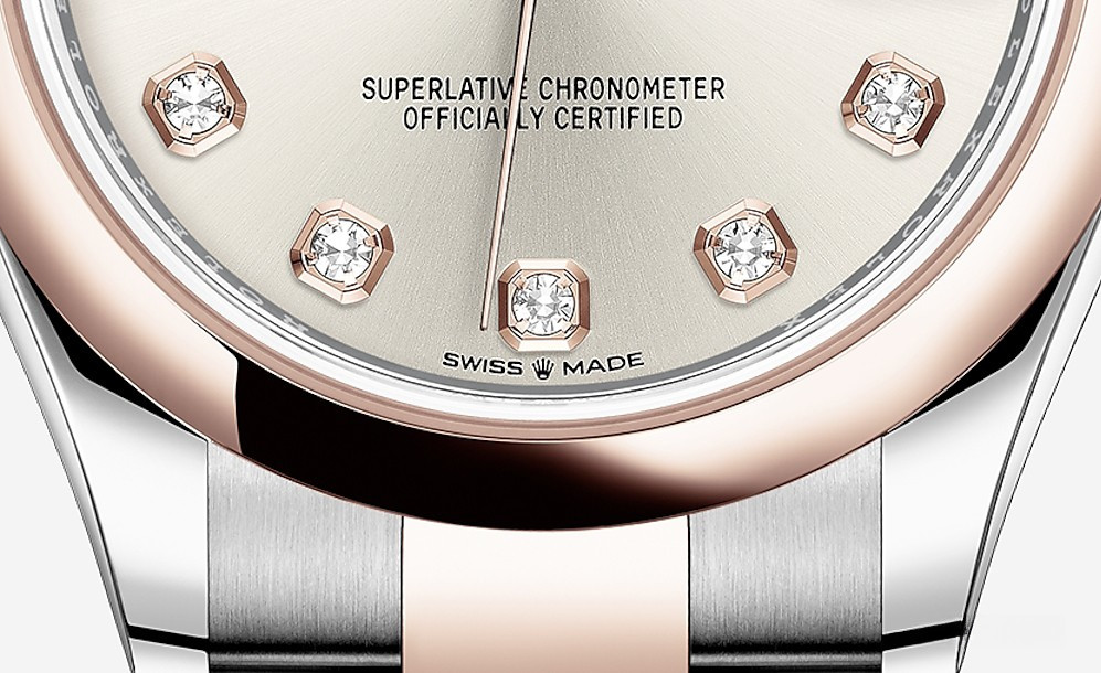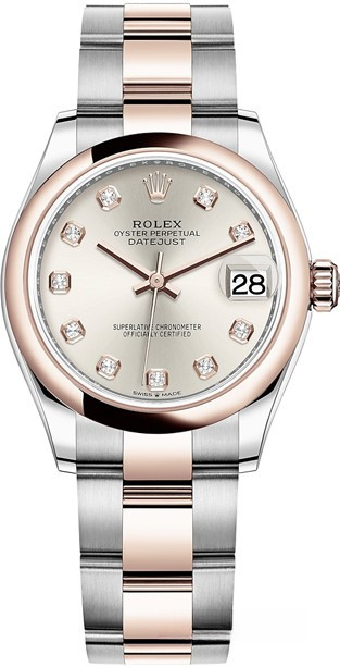 Часы Rolex Datejust Datejust 31mm Steel and Everose Gold - женские современные часы размером 31 х 10 мм из  розового золота и нержавеющей стали. Модель оснащена механизмом Rolex 2236 с устройством автоматического подзавода «Вечный ротор». Часы имеют серебристый циферблат с 10-ю белыми бриллиантами, сапфировое стекло с антибликовым покрытием, а в положении «3 часа» расположено окошко даты. Знаменитая циклопная линза, добавленная к обычному стеклу, – изобретение компании Rolex 1953 года – позволяет в 2,5 раза увеличить размер даты для более удобного считывания показаний. Уровень водонепроницаемости до 100 м. Модель дополнена браслетом из 18 кратного розового золота и нержавеющей стали.