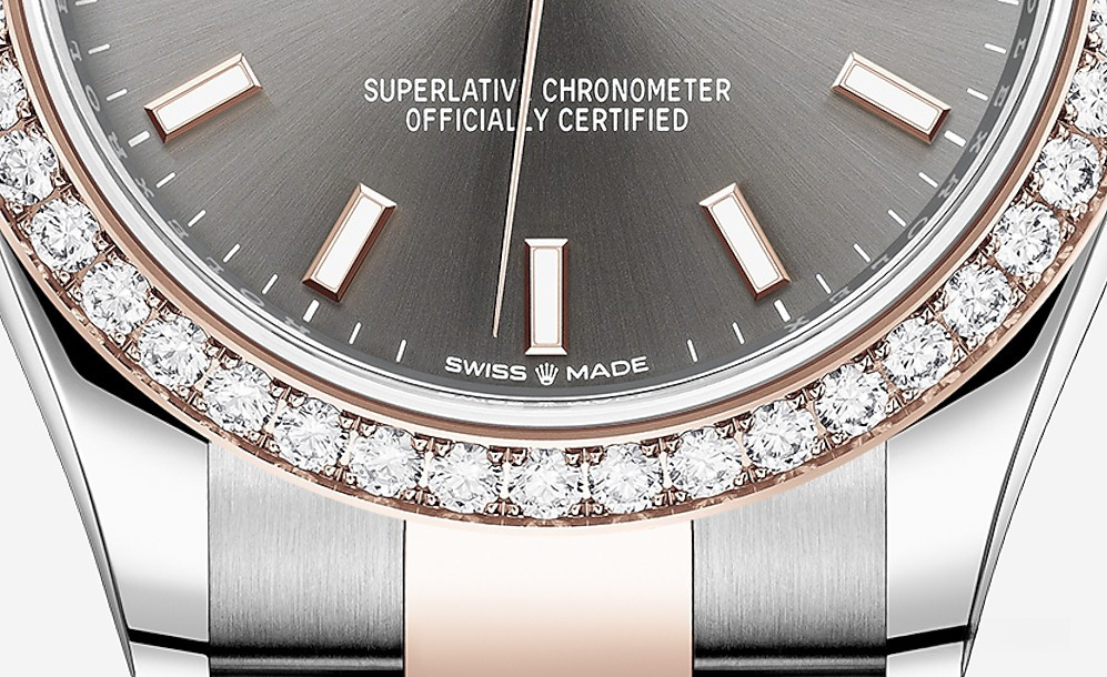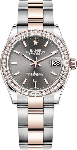Часы Rolex Datejust Datejust 31mm Steel and Everose Gold - женские современные часы размером 31 х 10 мм из  розового золота и нержавеющей стали. Модель оснащена механизмом Rolex 2236 с устройством автоматического подзавода «Вечный ротор». Часы имеют серый циферблат, сапфировое стекло с антибликовым покрытием, а в положении «3 часа» расположено окошко даты. Знаменитая циклопная линза, добавленная к обычному стеклу, – изобретение компании Rolex 1953 года – позволяет в 2,5 раза увеличить размер даты для более удобного считывания показаний. Уровень водонепроницаемости до 100 м. Модель дополнена браслетом из 18 кратного розового золота и нержавеющей стали. Безель из белых бриллиантов.