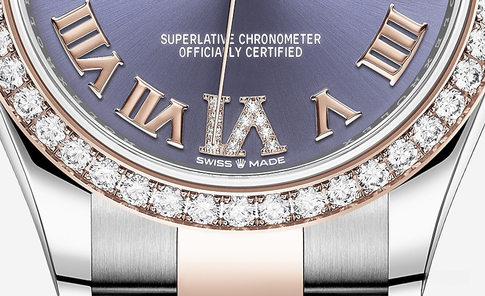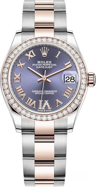 Часы Rolex Datejust Datejust 31mm Steel and Everose Gold - женские современные часы размером 31 х 10 мм из  розового золота и нержавеющей стали. Модель оснащена механизмом Rolex 2236 с устройством автоматического подзавода «Вечный ротор». Часы имеют синий циферблат с белыми бриллиантами, сапфировое стекло с антибликовым покрытием, а в положении «3 часа» расположено окошко даты. Знаменитая циклопная линза, добавленная к обычному стеклу, – изобретение компании Rolex 1953 года – позволяет в 2,5 раза увеличить размер даты для более удобного считывания показаний. Уровень водонепроницаемости до 100 м. Модель дополнена браслетом из 18 кратного розового золота и нержавеющей стали. Безель из белых бриллиантов.