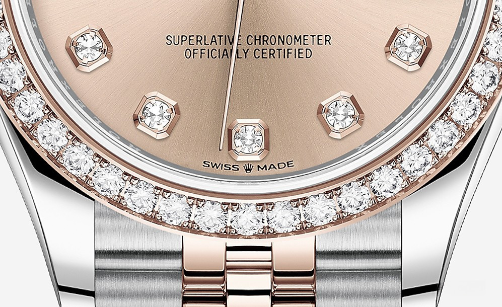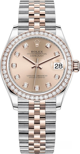 Часы Rolex Datejust Datejust 31mm Steel and Everose Gold - женские современные часы размером 31 х 10 мм из  розового золота и нержавеющей стали. Модель оснащена механизмом Rolex 2236 с устройством автоматического подзавода «Вечный ротор». Часы имеют золотистый циферблат с 10-ю белыми бриллиантами, сапфировое стекло с антибликовым покрытием, а в положении «3 часа» расположено окошко даты. Знаменитая циклопная линза, добавленная к обычному стеклу, – изобретение компании Rolex 1953 года – позволяет в 2,5 раза увеличить размер даты для более удобного считывания показаний. Уровень водонепроницаемости до 100 м. Модель дополнена браслетом из 18 кратного розового золота и нержавеющей стали. Безель из белых бриллиантов.