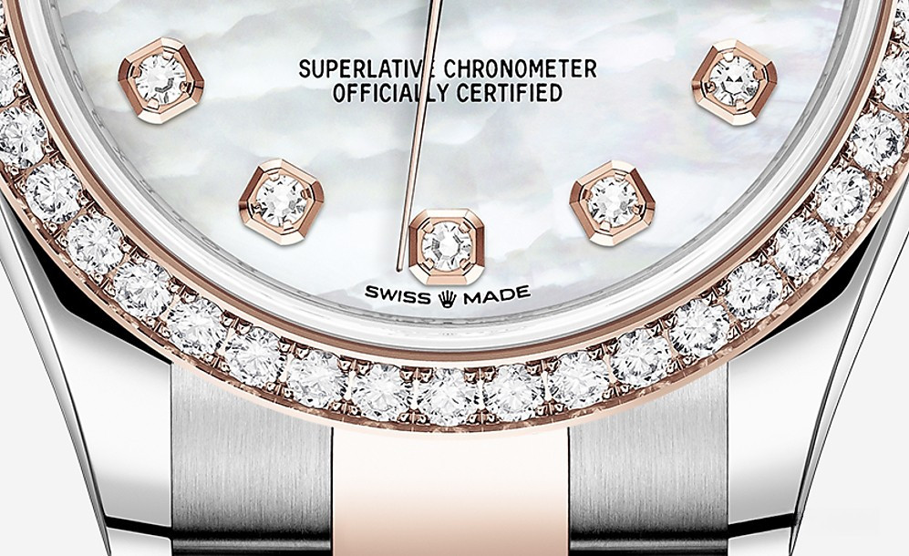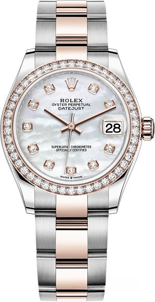 Часы Rolex Datejust Datejust 31mm Steel and Everose Gold - женские современные часы размером 31 х 10 мм из розового золота и нержавеющей стали. Модель оснащена механизмом Rolex 2236 с устройством автоматического подзавода «Вечный ротор». Часы имеют белый жемчужный циферблат с 10-ю белыми бриллиантами, сапфировое стекло с антибликовым покрытием, а в положении «3 часа» расположено окошко даты. Знаменитая циклопная линза, добавленная к обычному стеклу, – изобретение компании Rolex 1953 года – позволяет в 2,5 раза увеличить размер даты для более удобного считывания показаний. Уровень водонепроницаемости до 100 м. Модель дополнена браслетом из 18 кратного розового золота и нержавеющей стали. Безель из белых бриллиантов.