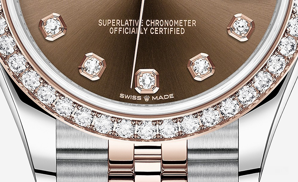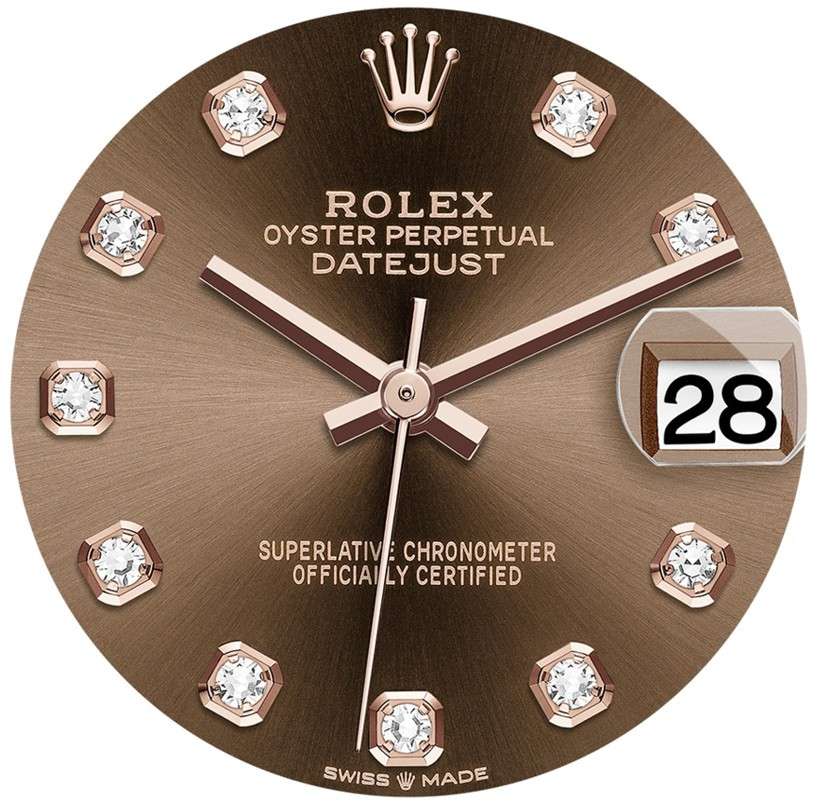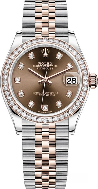 Часы Rolex Datejust Datejust 31mm Steel and Everose Gold - женские современные часы размером 31 х 10 мм из розового золота и нержавеющей стали. Модель оснащена механизмом Rolex 2236 с устройством автоматического подзавода «Вечный ротор». Часы имеют коричневый циферблат с 10-ю белыми бриллиантами, сапфировое стекло с антибликовым покрытием, а в положении «3 часа» расположено окошко даты. Знаменитая циклопная линза, добавленная к обычному стеклу, – изобретение компании Rolex 1953 года – позволяет в 2,5 раза увеличить размер даты для более удобного считывания показаний. Уровень водонепроницаемости до 100 м. Модель дополнена браслетом из 18 кратного розового золота и нержавеющей стали. Безель из белых бриллиантов.