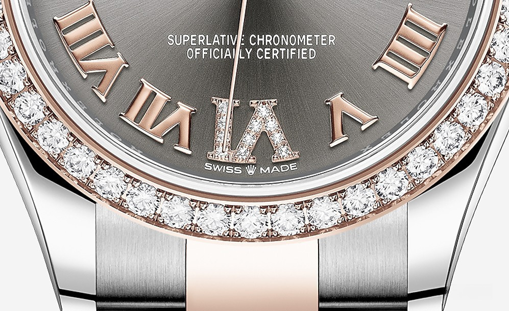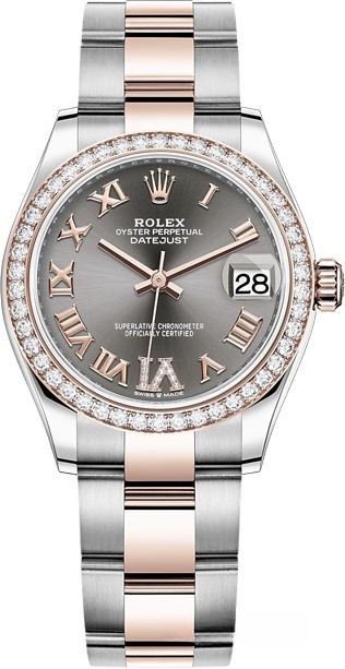Часы Rolex Datejust Datejust 31mm Steel and Everose Gold - женские современные часы размером 31 х 10 мм из розового золота и нержавеющей стали. Модель оснащена механизмом Rolex 2236 с устройством автоматического подзавода «Вечный ротор». Часы имеют серый циферблат с белыми бриллиантами, сапфировое стекло с антибликовым покрытием, а в положении «3 часа» расположено окошко даты. Знаменитая циклопная линза, добавленная к обычному стеклу, – изобретение компании Rolex 1953 года – позволяет в 2,5 раза увеличить размер даты для более удобного считывания показаний. Уровень водонепроницаемости до 100 м. Модель дополнена браслетом из 18 кратного розового золота и нержавеющей стали. Безель из белых бриллиантов.