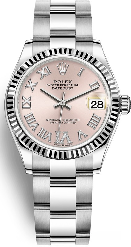 Водостойкие часы Rolex Datejust Datejust 31mm Steel and White Gold выпущены в круглом корпусе из белого золота и нержавеющей стали. Размер составляет 31 мм, водонепроницаемость 100 м. Внутри корпуса установлен автоматический механизм, Калибр Rolex 2236, обладающий запасом хода 55 часов. На розовом циферблате с белыми бриллиантами отображаются часы, минуты, секунды, дата. Часы комплектуются браслетом из белого золота 18к и нержавеющей стали.
