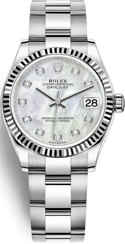 Водостойкие часы Rolex Datejust Datejust 31mm Steel and White Gold выпущены в круглом корпусе из белого золота и нержавеющей стали. Размер составляет 31 мм, водонепроницаемость 100 м. Внутри корпуса установлен автоматический механизм, Калибр Rolex 2236, обладающий запасом хода 55 часов. На белом жемчужном циферблате с 10-ю белыми бриллиантами отображаются часы, минуты, секунды, дата. Часы комплектуются браслетом из белого золота 18к и нержавеющей стали.