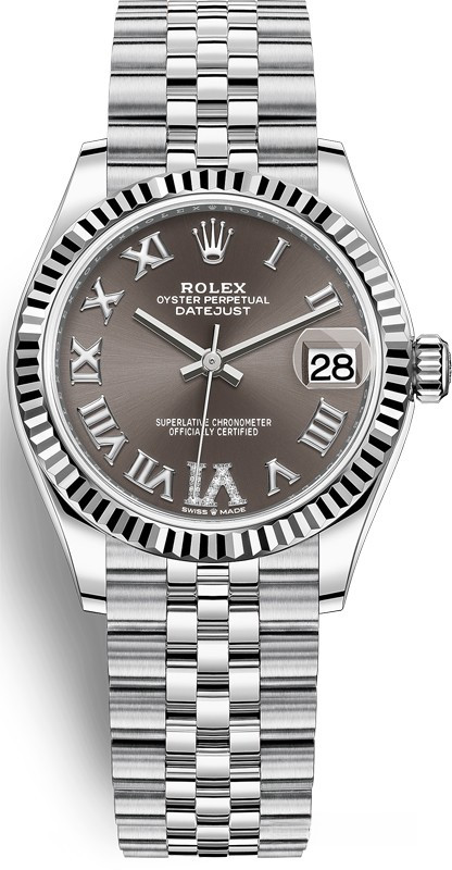 Водостойкие часы Rolex Datejust Datejust 31mm Steel and White Gold выпущены в круглом корпусе из белого золота и нержавеющей стали. Размер составляет 31 мм, водонепроницаемость 100 м. Внутри корпуса установлен автоматический механизм, Калибр Rolex 2236, обладающий запасом хода 55 часов. На сером циферблате с белыми бриллиантами отображаются часы, минуты, секунды, дата. Часы комплектуются браслетом из белого золота 18к и нержавеющей стали.