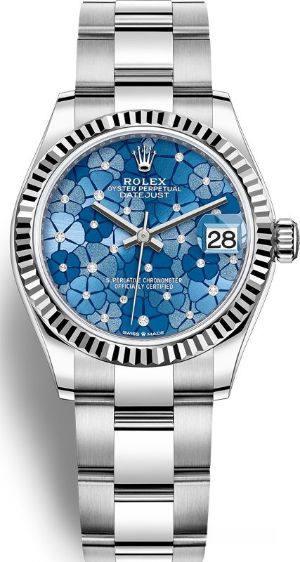Водостойкие часы Rolex Datejust Datejust 31mm Steel and White Gold выпущены в круглом корпусе из белого золота и нержавеющей стали. Размер составляет 31 мм, водонепроницаемость 100 м. Внутри корпуса установлен автоматический механизм, Калибр Rolex 2236, обладающий запасом хода 55 часов. На синем циферблате с белыми бриллиантами отображаются часы, минуты, секунды, дата. Часы комплектуются браслетом из нержавеющей стали.