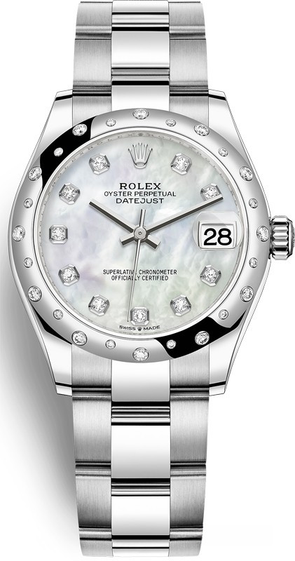 Водостойкие часы Rolex Datejust Datejust 31mm Steel and White Gold выпущены в круглом корпусе из белого золота и нержавеющей стали. Размер составляет 31 мм, водонепроницаемость 100 м. Внутри корпуса установлен автоматический механизм, Калибр Rolex 2236, обладающий запасом хода 55 часов. На белом жемчужном циферблате с 10-ю белыми бриллиантами отображаются часы, минуты, секунды, дата. Часы комплектуются браслетом из белого золота 18к и нержавеющей стали. Безель из белых бриллиантов.