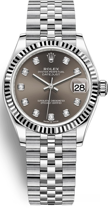 Водостойкие часы Rolex Datejust Datejust 31mm Steel and White Gold выпущены в круглом корпусе из белого золота и нержавеющей стали. Размер составляет 31 мм, водонепроницаемость 100 м. Внутри корпуса установлен автоматический механизм, Калибр Rolex 2236, обладающий запасом хода 55 часов. На сером циферблате с 10-ю белыми бриллиантами отображаются часы, минуты, секунды, дата. Часы комплектуются браслетом из белого золота 18к и нержавеющей стали.