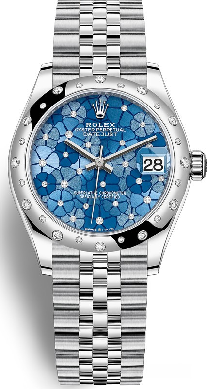 Водостойкие часы Rolex Datejust Datejust 31mm Steel and White Gold выпущены в круглом корпусе из белого золота и нержавеющей стали. Размер составляет 31 мм, водонепроницаемость 100 м. Внутри корпуса установлен автоматический механизм, Калибр Rolex 2236, обладающий запасом хода 55 часов. На синем циферблате с белыми бриллиантами отображаются часы, минуты, секунды, дата. Часы комплектуются браслетом из нержавеющей стали. Безель из белых бриллиантов.