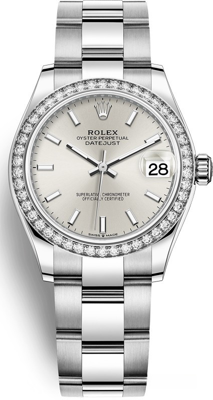 Водостойкие часы Rolex Datejust Datejust 31mm Steel and White Gold выпущены в круглом корпусе из белого золота и нержавеющей стали. Размер составляет 31 мм, водонепроницаемость 100 м. Внутри корпуса установлен автоматический механизм, Калибр Rolex 2236, обладающий запасом хода 55 часов. На серебристом циферблате отображаются часы, минуты, секунды, дата. Часы комплектуются браслетом из белого золота 18к и нержавеющей стали. Безель из белых бриллиантов.