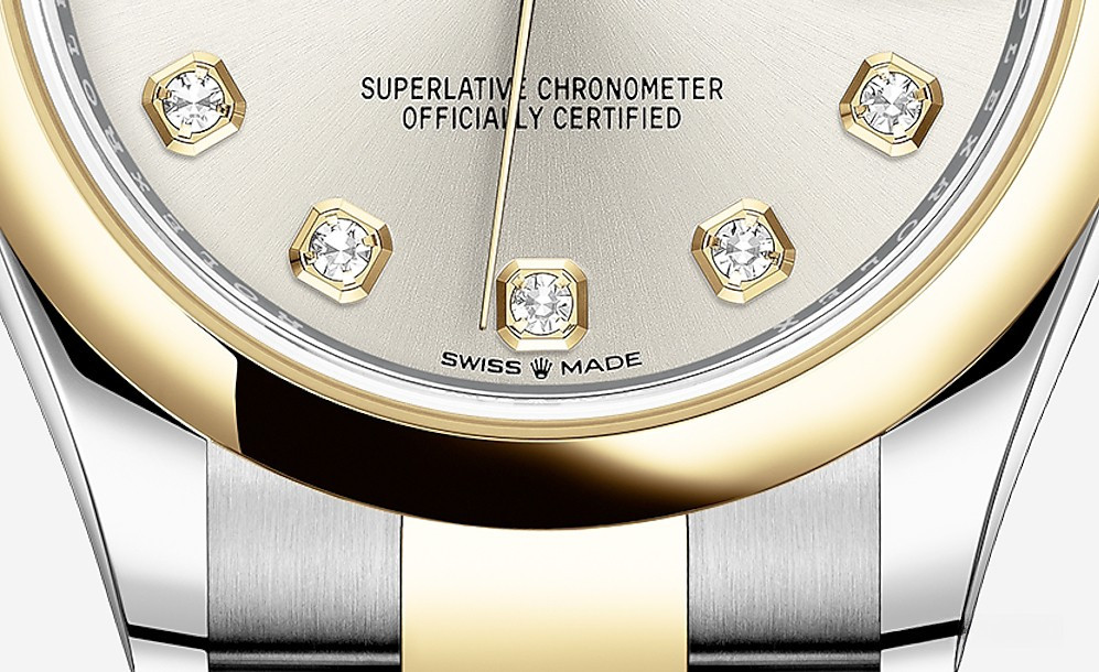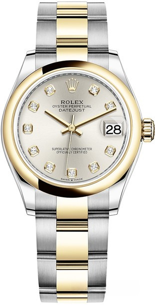 Водостойкие часы Rolex Datejust Datejust 31mm Steel and Yellow Gold выпущены в круглом корпусе из желтого золота 18к и нержавеющей стали. Размер составляет 31 мм, водонепроницаемость 100 м. Внутри корпуса установлен автоматический механизм. На серебристом циферблате с 10-ю белыми бриллиантами отображаются часы, минуты, секунды, дата. Часы комплектуются браслетом из желтого золота 18к и нержавеющей стали.