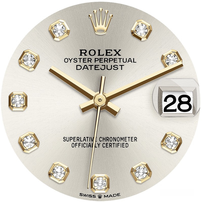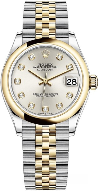 Водостойкие часы Rolex Datejust Datejust 31mm Steel and Yellow Gold выпущены в круглом корпусе из желтого золота 18к и нержавеющей стали. Размер составляет 31 мм, водонепроницаемость 100 м. Внутри корпуса установлен автоматический механизм. На серебристом циферблате с 10-ю белыми бриллиантами отображаются часы, минуты, секунды, дата. Часы комплектуются браслетом из желтого золота 18к и нержавеющей стали.
