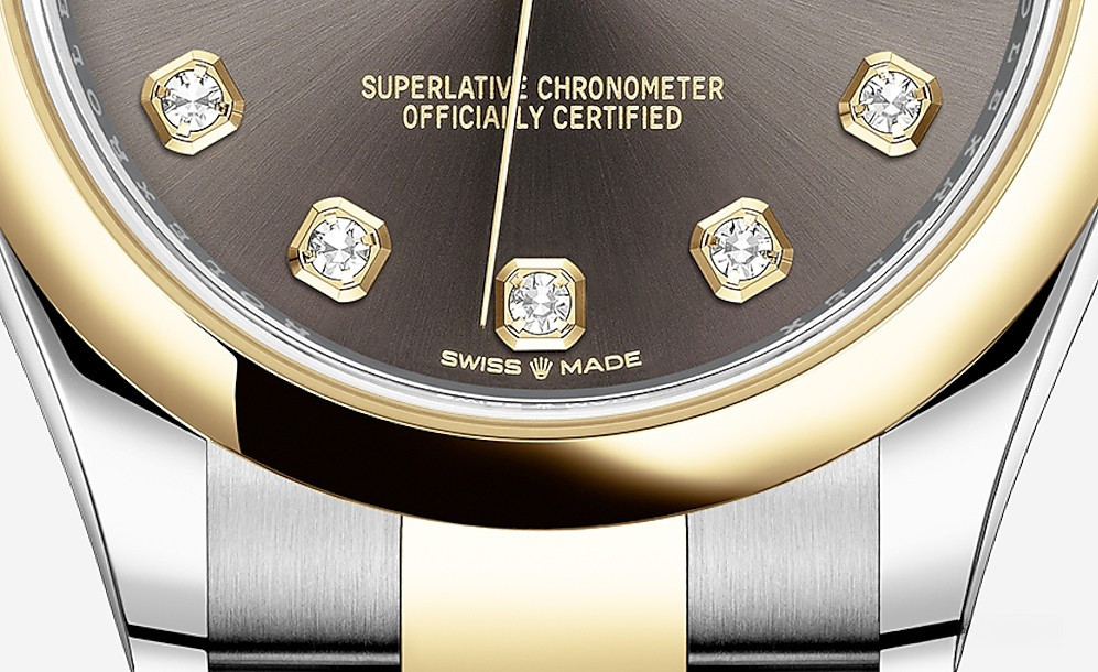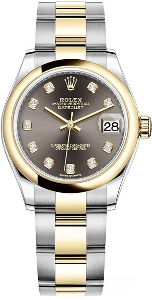Водостойкие часы Rolex Datejust Datejust 31mm Steel and Yellow Gold выпущены в круглом корпусе из желтого золота 18к и нержавеющей стали. Размер составляет 31 мм, водонепроницаемость 100 м. Внутри корпуса установлен автоматический механизм. На сером циферблате с 10-ю белыми бриллиантами отображаются часы, минуты, секунды, дата. Часы комплектуются браслетом из желтого золота 18к и нержавеющей стали.
