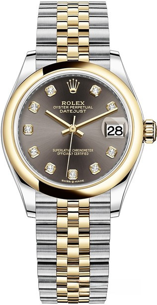 Водостойкие часы Rolex Datejust Datejust 31mm Steel and Yellow Gold выпущены в круглом корпусе из желтого золота 18к и нержавеющей стали. Размер составляет 31 мм, водонепроницаемость 100 м. Внутри корпуса установлен автоматический механизм. На сером циферблате с 10-ю белыми бриллиантами отображаются часы, минуты, секунды, дата. Часы комплектуются браслетом из желтого золота 18к и нержавеющей стали.