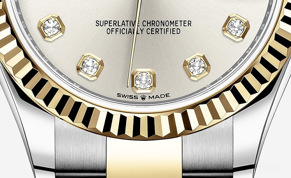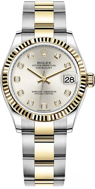 Водостойкие часы Rolex Datejust Datejust 31mm Steel and Yellow Gold выпущены в круглом корпусе из желтого золота 18к и нержавеющей стали. Размер составляет 31 мм, водонепроницаемость 100 м. Внутри корпуса установлен автоматический механизм. На серебристом циферблате с 10-ю белыми бриллиантами отображаются часы, минуты, секунды, дата. Часы комплектуются браслетом из желтого золота 18к и нержавеющей стали.