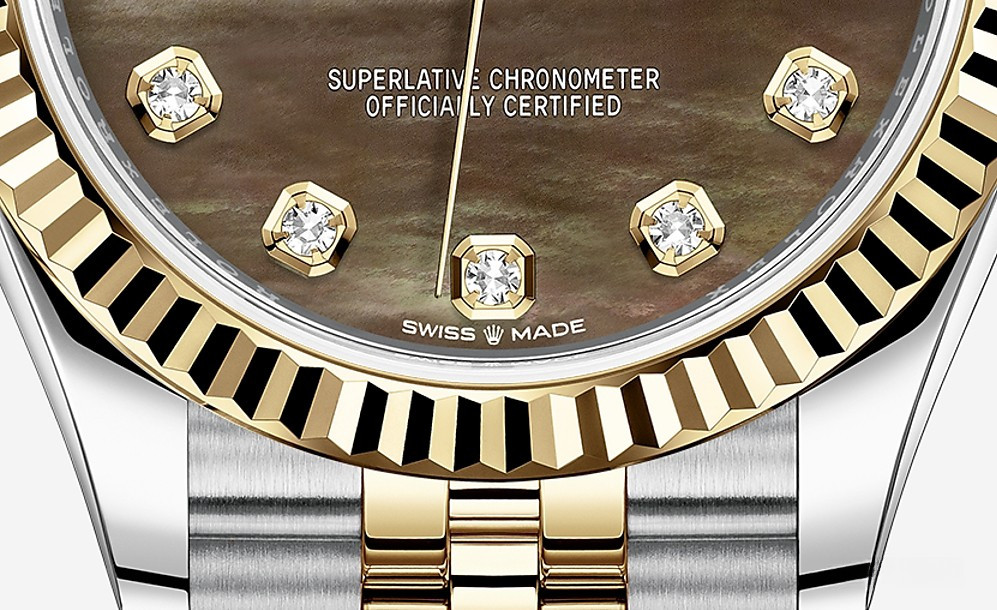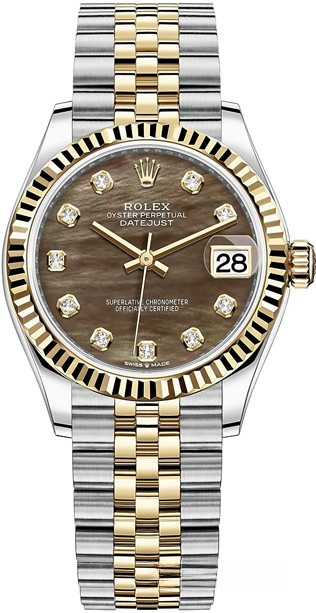 Водостойкие часы Rolex Datejust Datejust 31mm Steel and Yellow Gold выпущены в круглом корпусе из желтого золота 18к и нержавеющей стали. Размер составляет 31 мм, водонепроницаемость 100 м. Внутри корпуса установлен автоматический механизм. На черном жемчужном циферблате с 10-ю белыми бриллиантами отображаются часы, минуты, секунды, дата. Часы комплектуются браслетом из желтого золота 18к и нержавеющей стали.