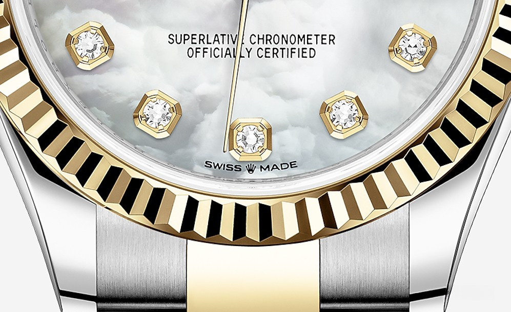 Водостойкие часы Rolex Datejust Datejust 31mm Steel and Yellow Gold выпущены в круглом корпусе из желтого золота 18к и нержавеющей стали. Размер составляет 31 мм, водонепроницаемость 100 м. Внутри корпуса установлен автоматический механизм. На белом жемчужном циферблате с 10-ю белыми бриллиантами отображаются часы, минуты, секунды, дата. Часы комплектуются браслетом из желтого золота 18к и нержавеющей стали.
