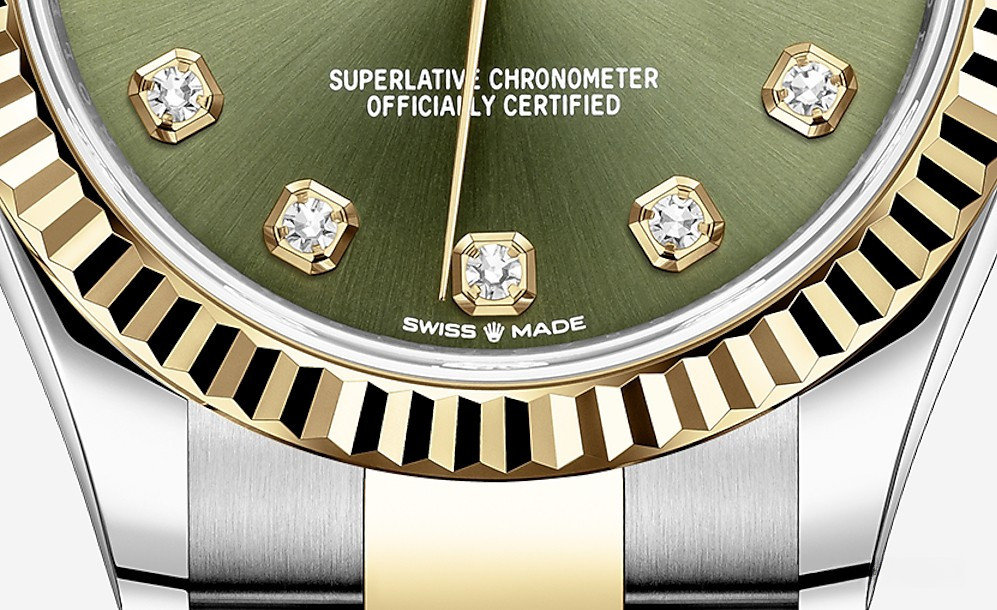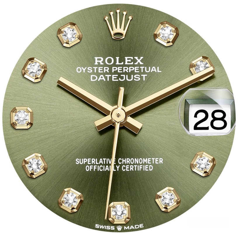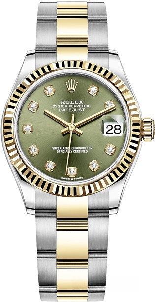 Водостойкие часы Rolex Datejust Datejust 31mm Steel and Yellow Gold выпущены в круглом корпусе из желтого золота 18к и нержавеющей стали. Размер составляет 31 мм, водонепроницаемость 100 м. Внутри корпуса установлен автоматический механизм. На зеленом циферблате с 10-ю белыми бриллиантами отображаются часы, минуты, секунды, дата. Часы комплектуются браслетом из желтого золота 18к и нержавеющей стали.