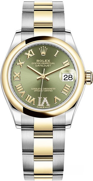Водостойкие часы Rolex Datejust Datejust 31mm Steel and Yellow Gold выпущены в круглом корпусе из желтого золота 18к и нержавеющей стали. Размер составляет 31 мм, водонепроницаемость 100 м. Внутри корпуса установлен автоматический механизм. На зеленом циферблате с белыми бриллиантами отображаются часы, минуты, секунды, дата. Часы комплектуются браслетом из желтого золота 18к и нержавеющей стали.