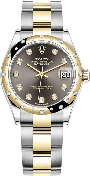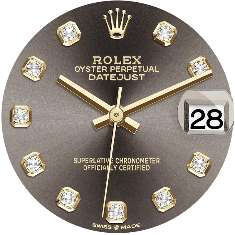 Водостойкие часы Rolex Datejust Datejust 31mm Steel and Yellow Gold выпущены в круглом корпусе из желтого золота 18к и нержавеющей стали. Размер составляет 31 мм, водонепроницаемость 100 м. Внутри корпуса установлен автоматический механизм. На сером циферблате с 10-ю белыми бриллиантами отображаются часы, минуты, секунды, дата. Часы комплектуются браслетом из желтого золота 18к и нержавеющей стали. Безель из белых бриллиантов.