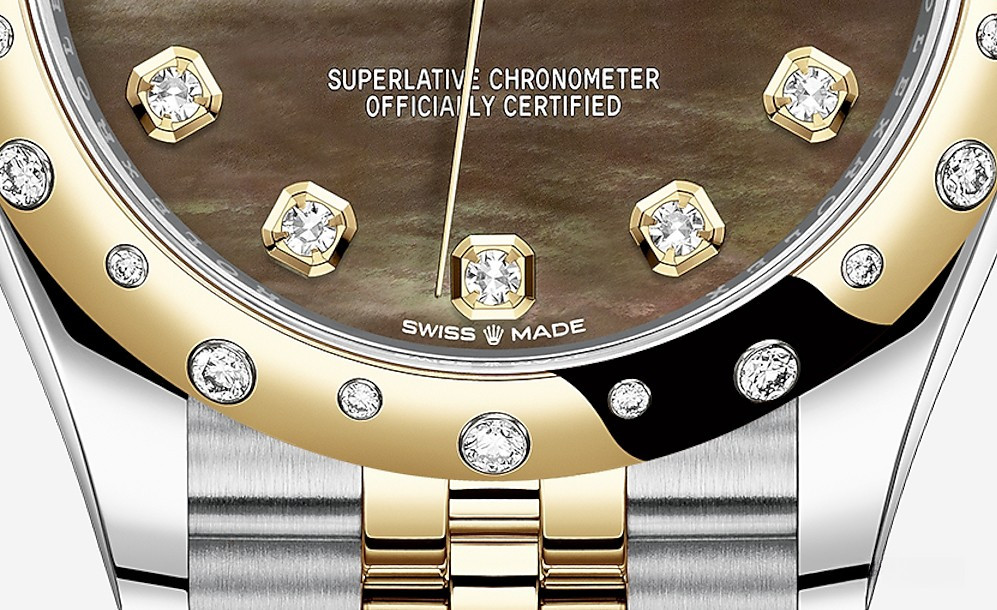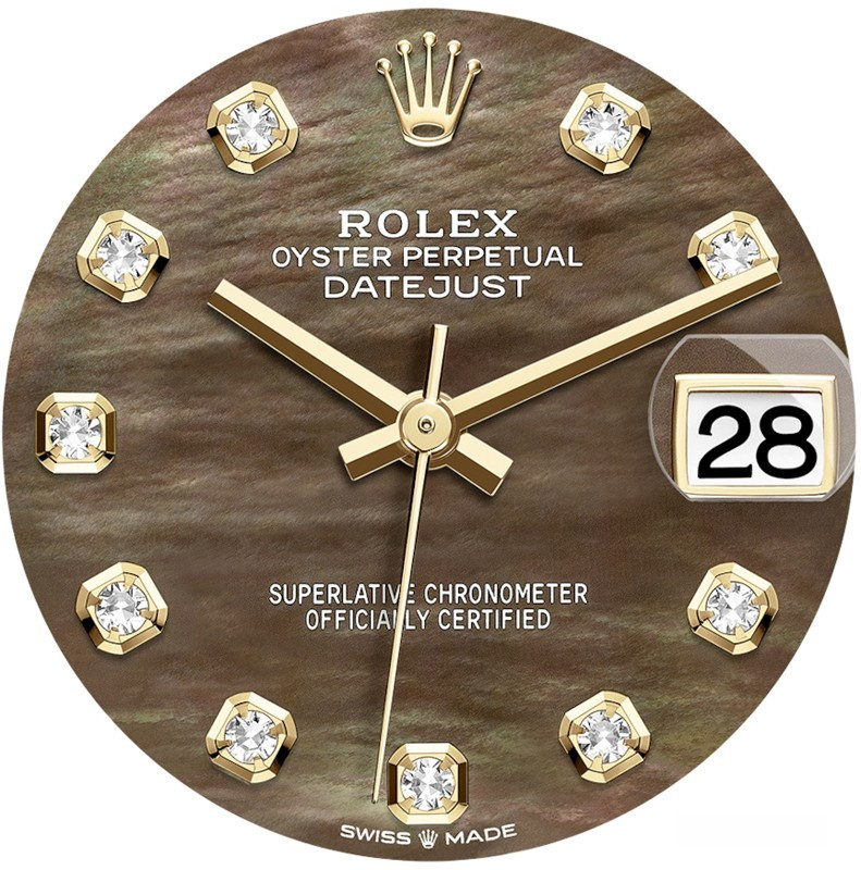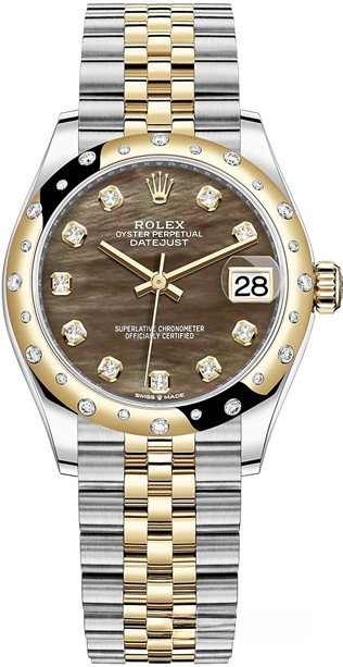 Водостойкие часы Rolex Datejust Datejust 31mm Steel and Yellow Gold выпущены в круглом корпусе из желтого золота 18к и нержавеющей стали. Размер составляет 31 мм, водонепроницаемость 100 м. Внутри корпуса установлен автоматический механизм. На черном жемчужном циферблате с 10-ю белыми бриллиантами отображаются часы, минуты, секунды, дата. Часы комплектуются браслетом из желтого золота 18к и нержавеющей стали. Безель из белых бриллиантов.