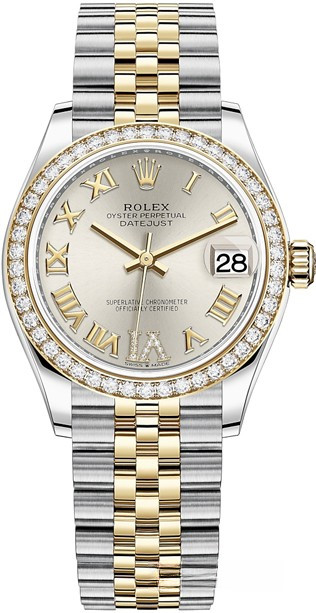 Водостойкие часы Rolex Datejust Datejust 31mm Steel and Yellow Gold выпущены в круглом корпусе из желтого золота 18к и нержавеющей стали. Размер составляет 31 мм, водонепроницаемость 100 м. Внутри корпуса установлен автоматический механизм. На серебристом циферблате с белыми бриллиантами отображаются часы, минуты, секунды, дата. Часы комплектуются браслетом из желтого золота 18к и нержавеющей стали. Безель из белых бриллиантов.